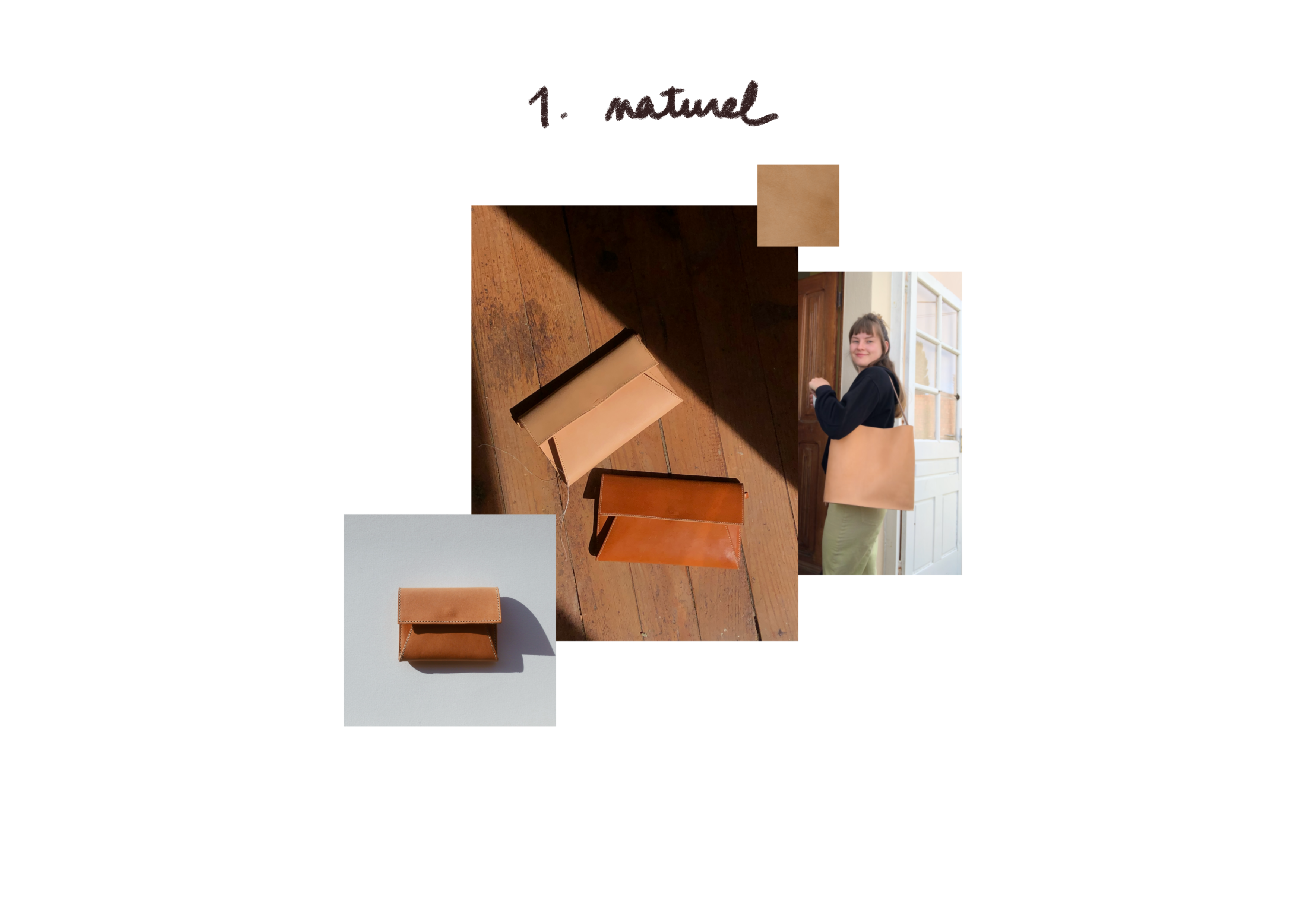 Le cuir est non teinté et comporte une finition transparente qui laisse voir chaque détails de la matière. Avec le temps, il bronze et tend vers le coloris renard. Sur la photo centrale, le compagnon de droite a un an et a obtenue sa teinte bronzée finale.