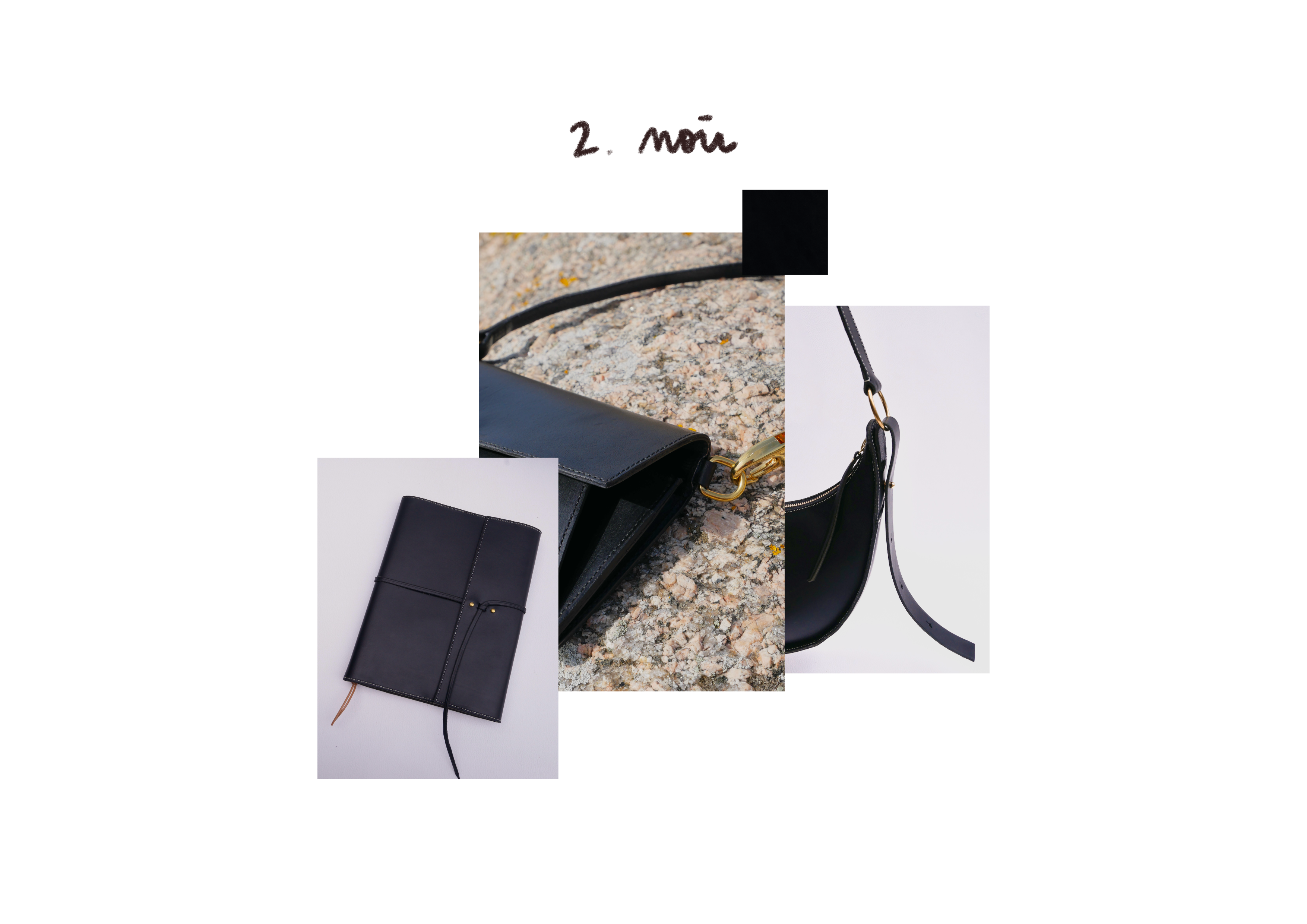 Le cuir est teinté dans la masse d'un noir profond aux reflets bleutés. Il comporte une finition transparente qui offre à toucher chaque détails de la matière.