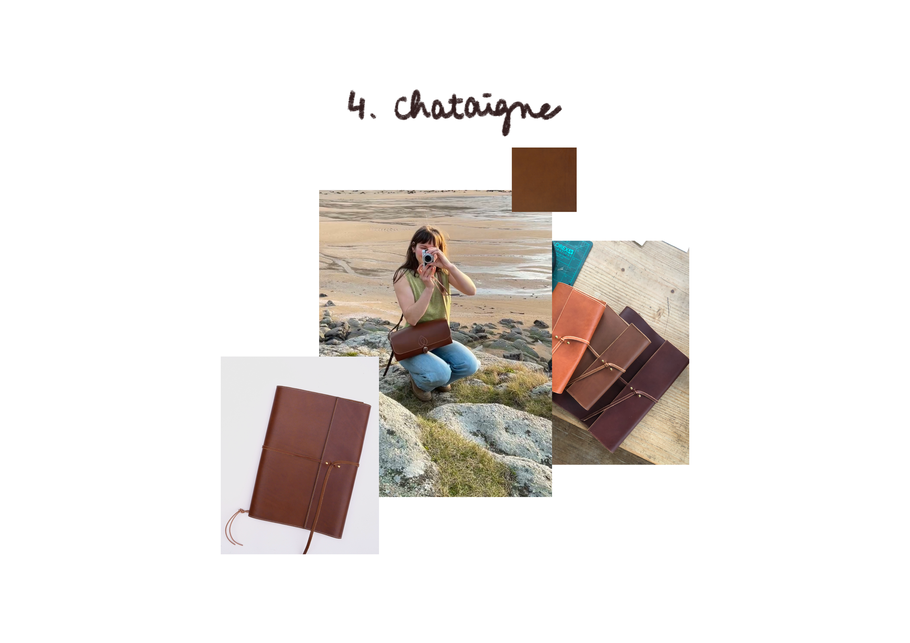 Le cuir est teinté dans la masse d'un sublime brun, le marron chaud parfait : ni trop orangé, ni trop rouge. Il comporte une finition transparente qui sublime chaque détails de la matière.