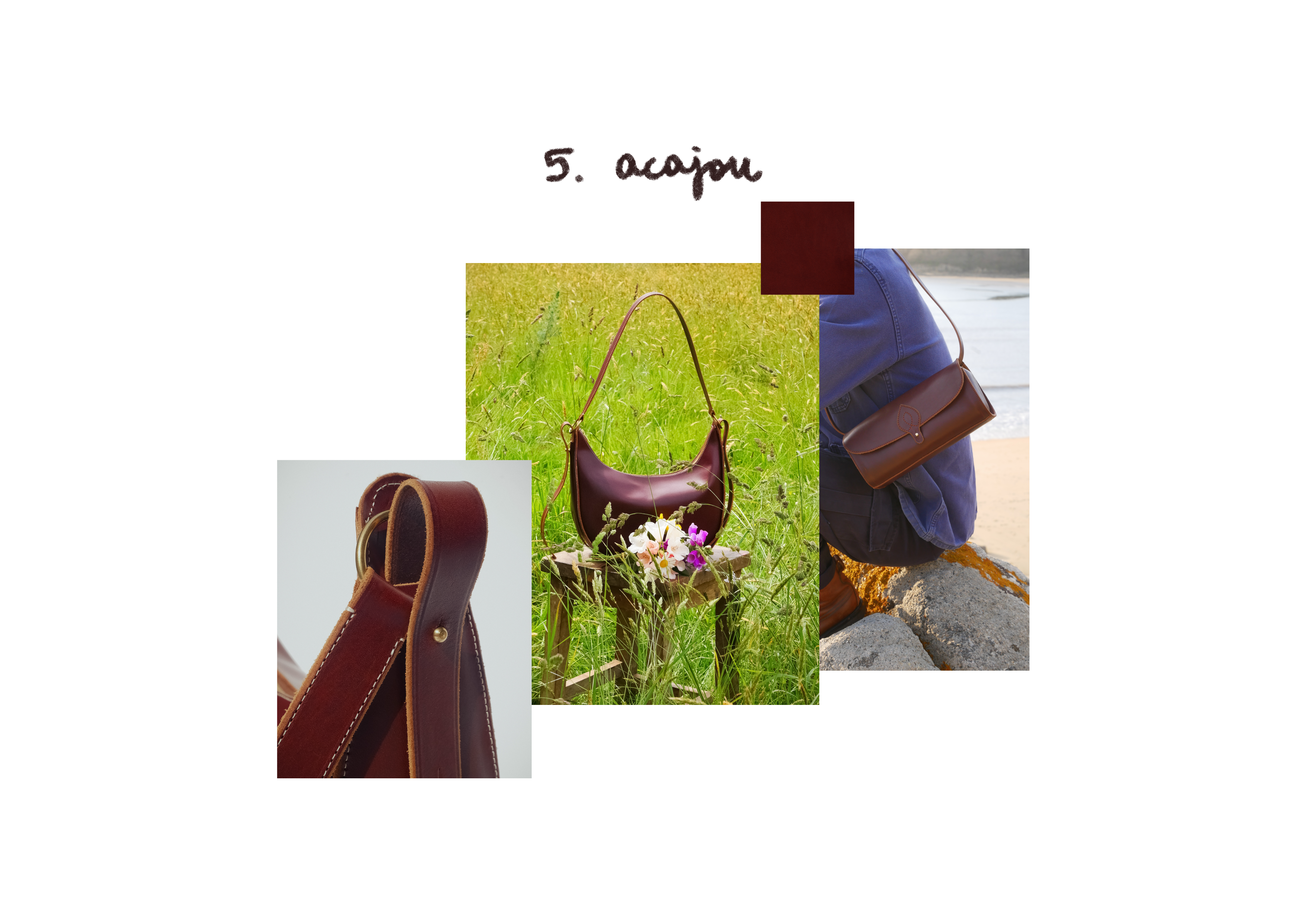 Le cuir est teinté dans la masse d'une couleur incroyable, à mi-chemin entre le bordeaux, le brun, le grenat et le lie-de-vin. Il comporte une finition transparente qui sublime chaque détails de la matière.