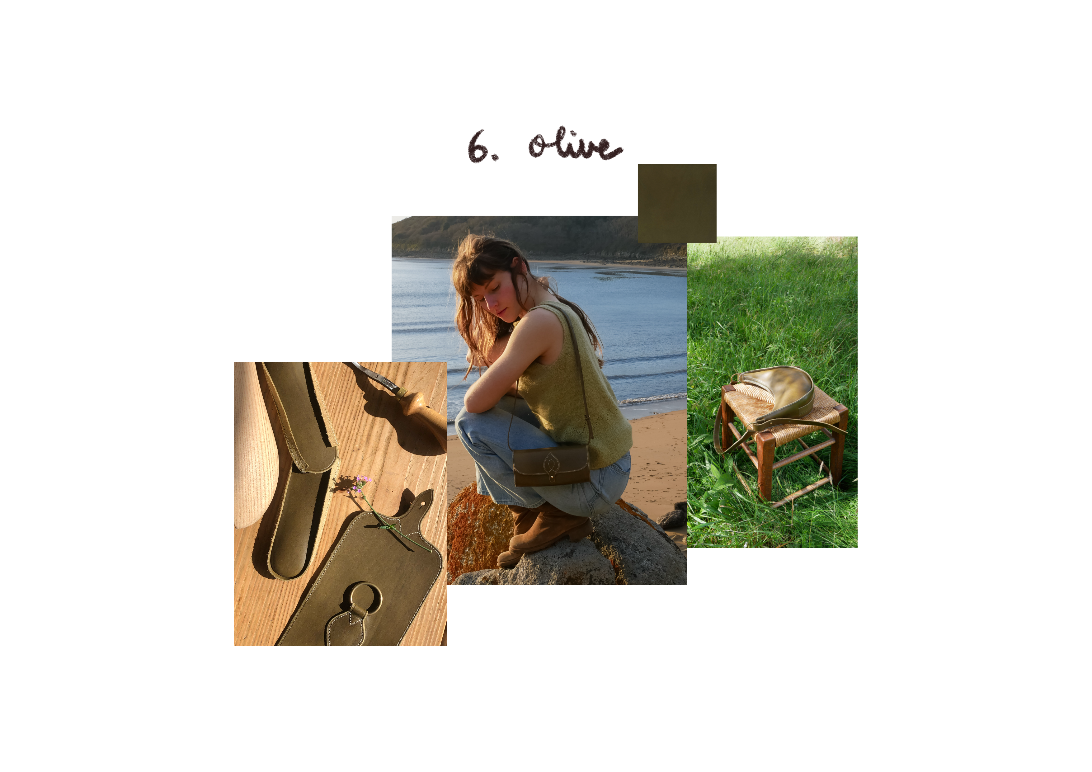 Le cuir est teinté dans la masse d'un sublime vert olive. Il comporte une finition transparente qui sublime chaque détails de la matière. Avec le temps et l'exposition au soleil, il se pigmente de couleurs plus chaude en tendant vers le coloris bronze.